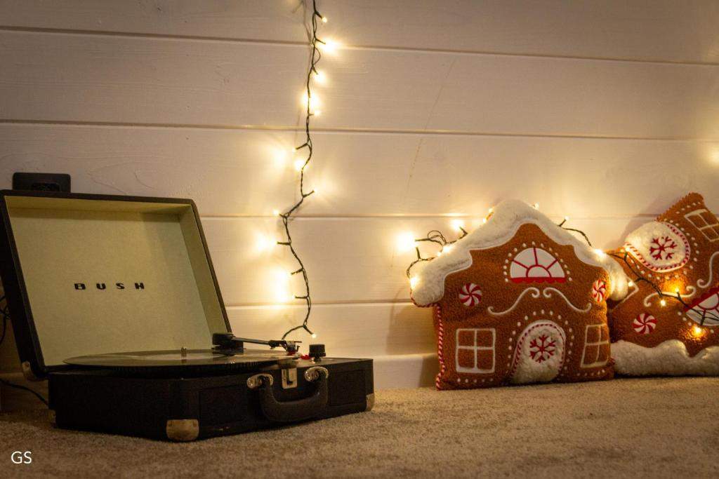 The Sound of the Forest House is a cozy retreat where music and nature blend beautifully. Inside, a vintage record player sets a gentle mood.