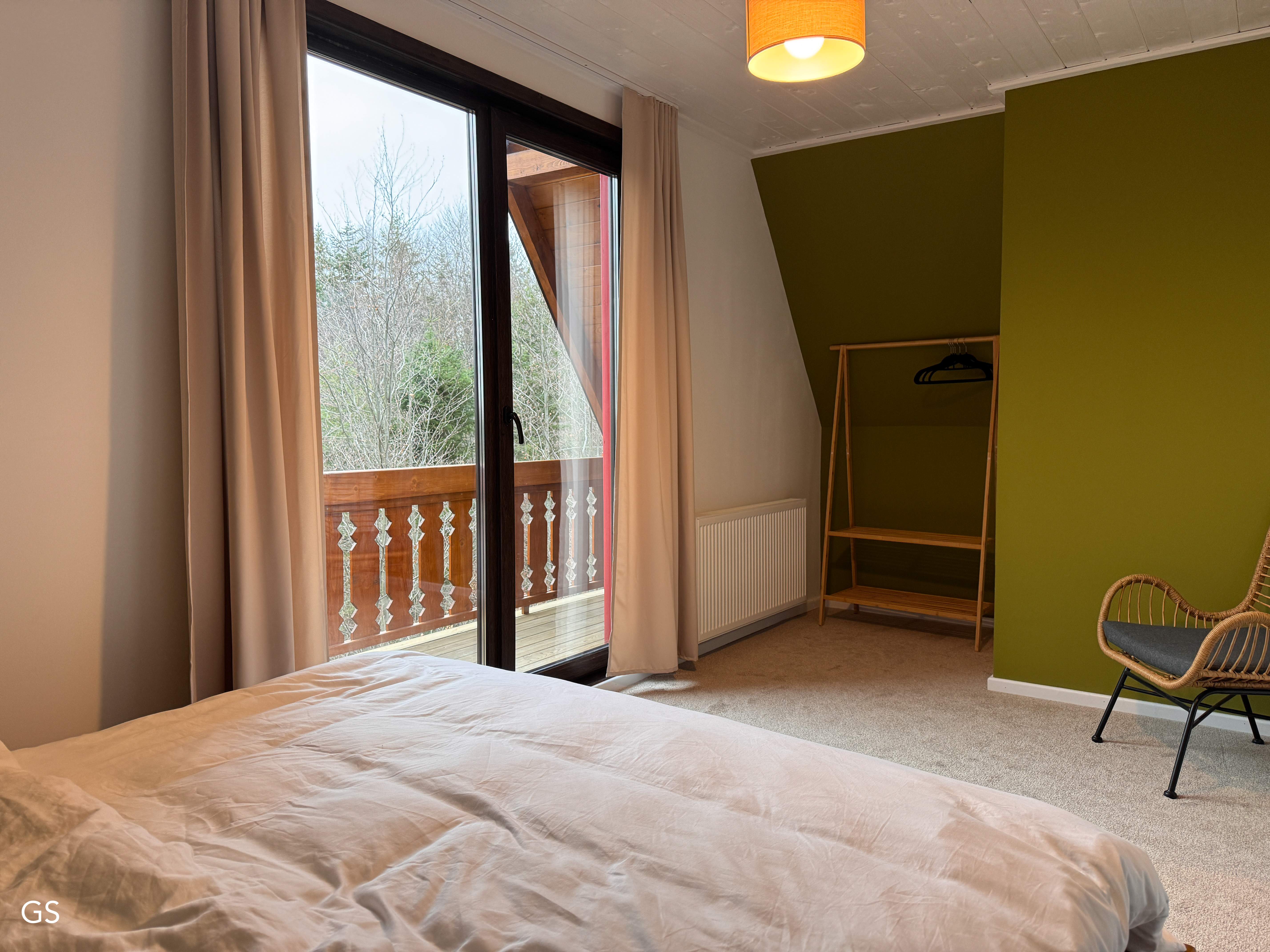 Two balconies offer the best of both worlds: one with a sweeping view of the cabin complex, the other nestled close to the trees for quiet moments. Slightly set apart, the house offers both privacy and comfort.